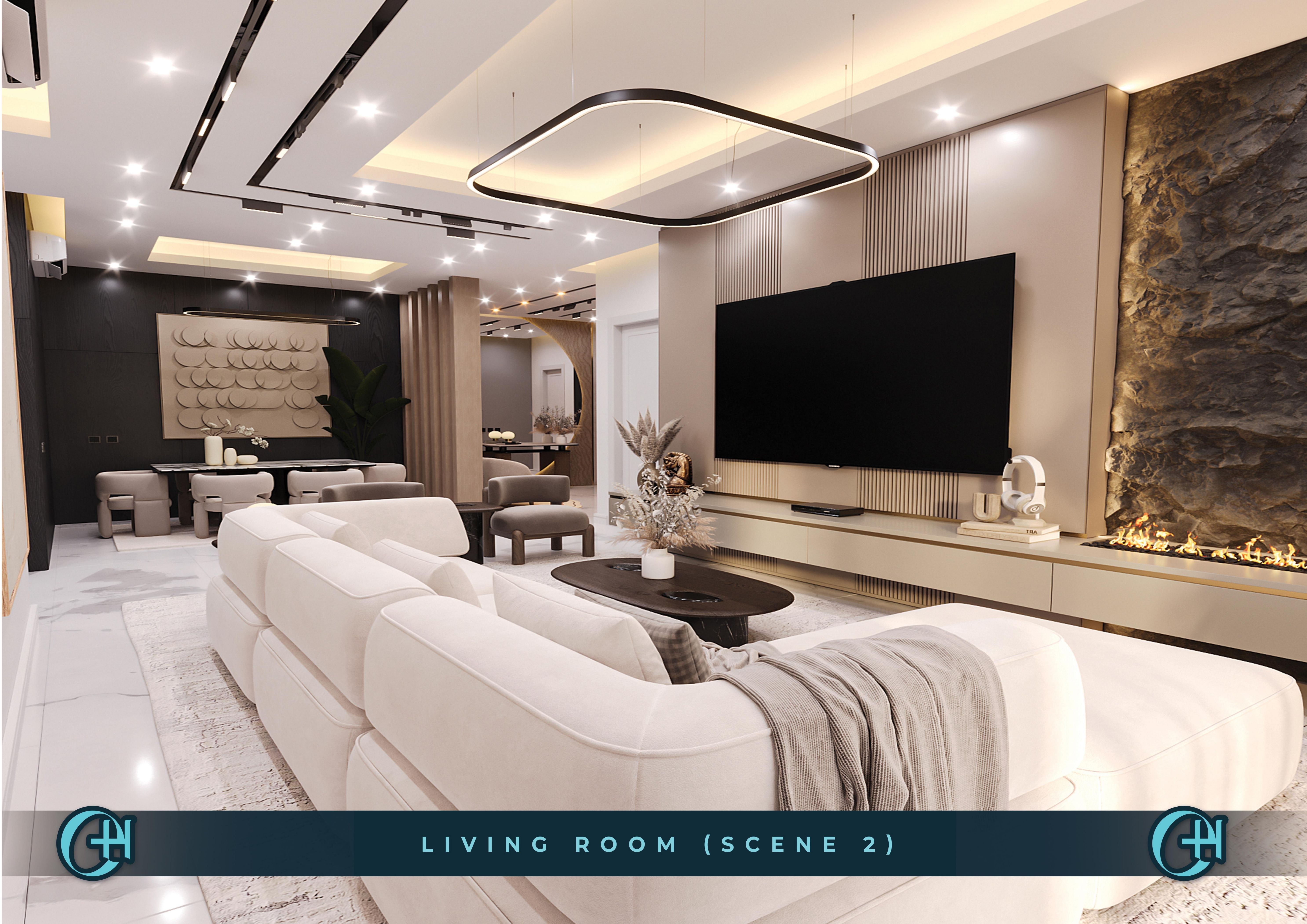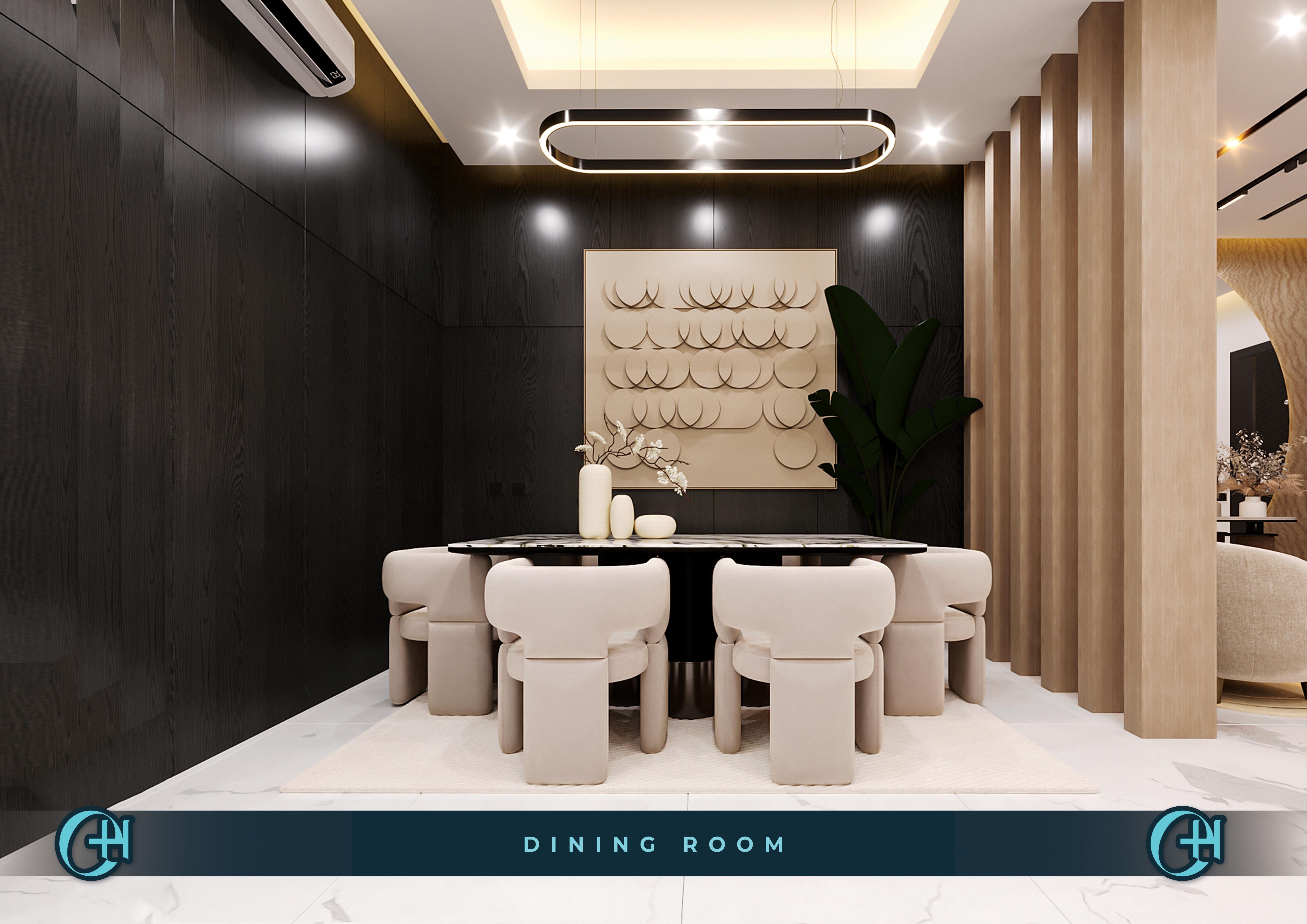 The apartments continue that standard. Living rooms are anchored by custom TV media walls with stone accents, oversized rectangular pendants, and track lighting that adds depth to generous ceiling heights. Dining rooms command attention — dark panelled feature walls, sculptural upholstered chairs, and oversized arc pendants setting a mood that works for quiet evenings and full-house entertainment alike.
