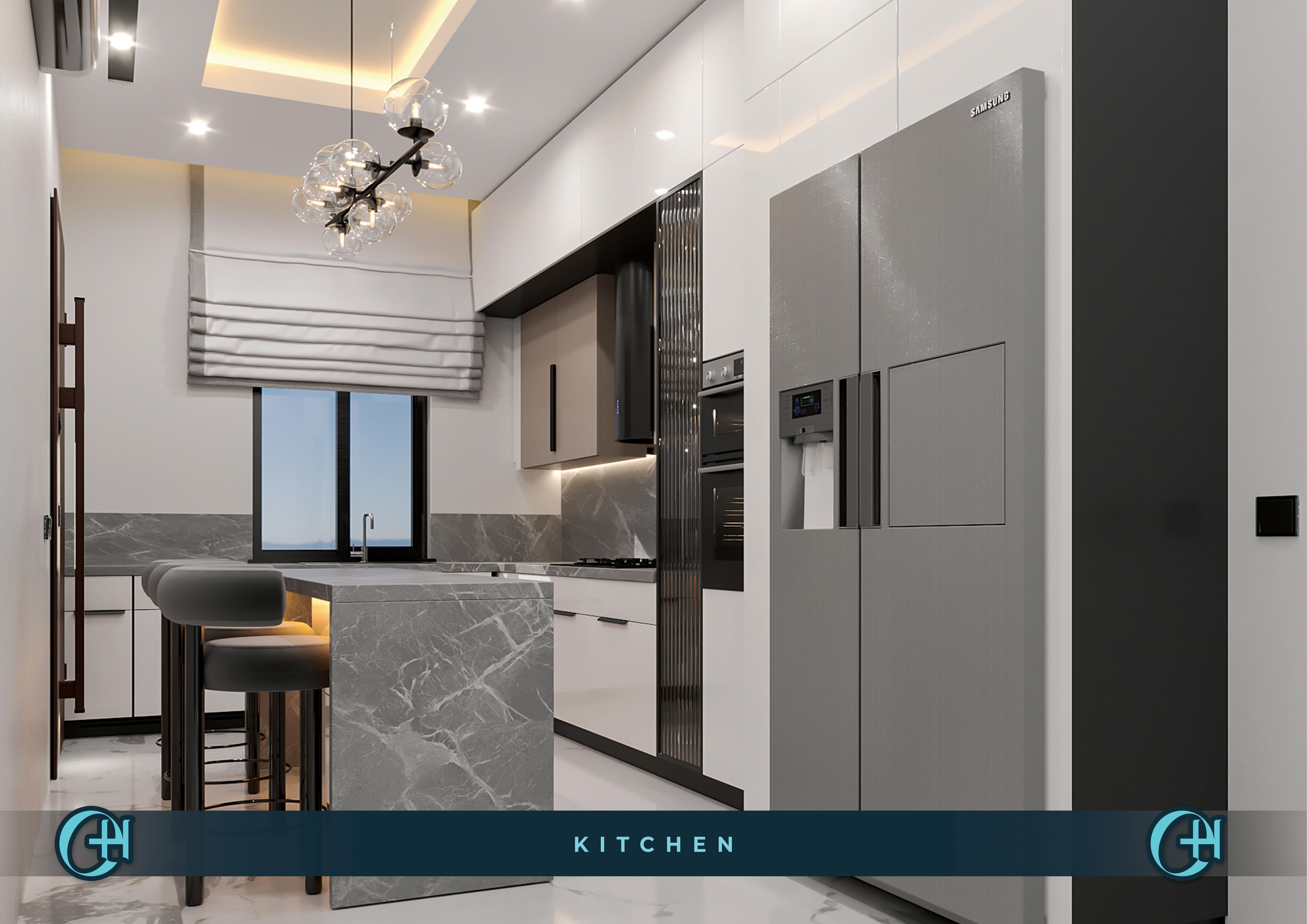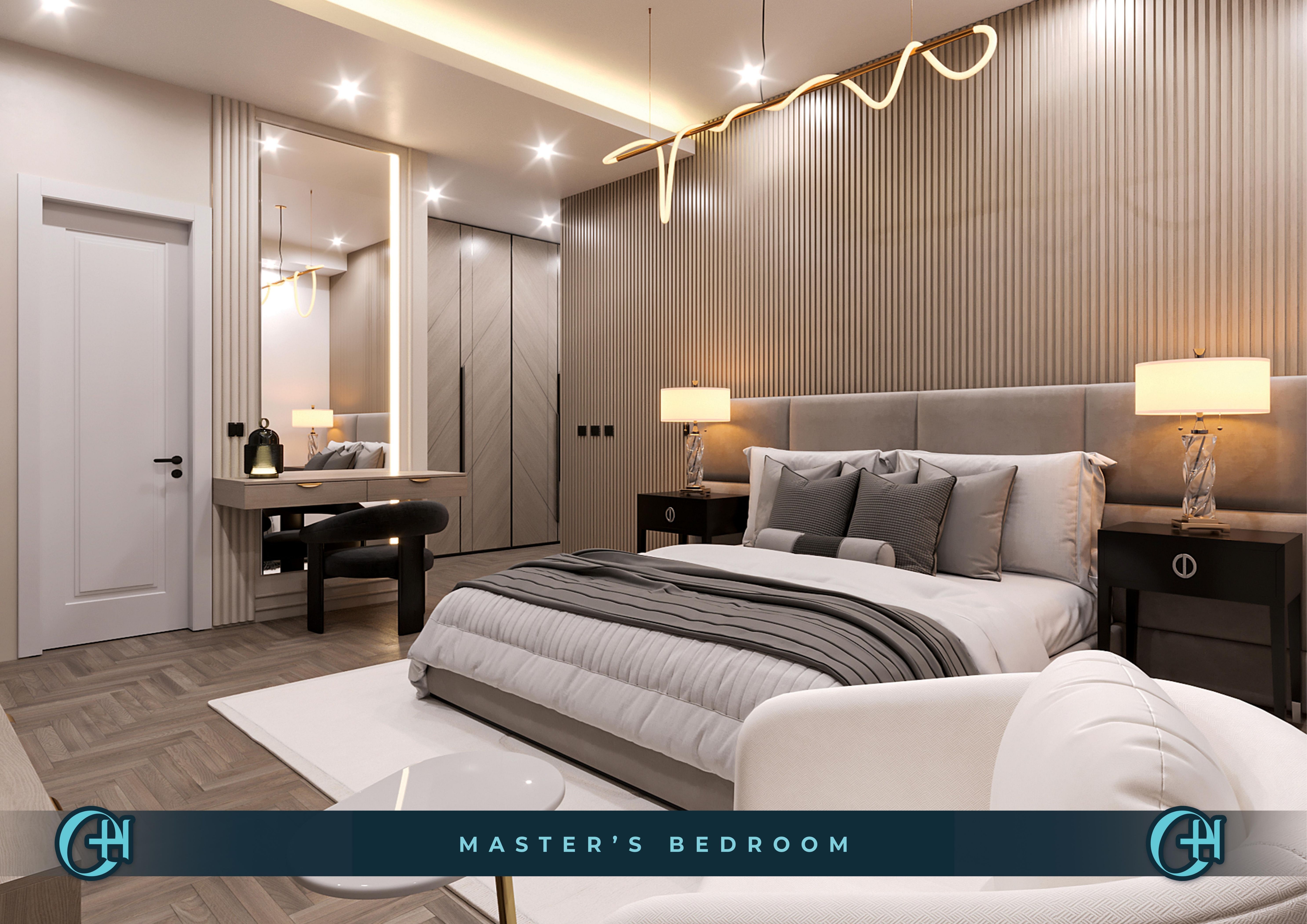 Kitchens are fitted with marble-topped central islands, globe pendant chandeliers, grey marble backsplashes, and integrated appliances including a Samsung side-by-side fridge. Master bedrooms feature fluted taupe headboard walls, a custom gold wave pendant, full-length mirror, and dressing area — a room that earns the word suite. Bathrooms carry through with rain showers, wall-hung sanitaryware, warm LED strip detail, and marble-look tiling throughout.