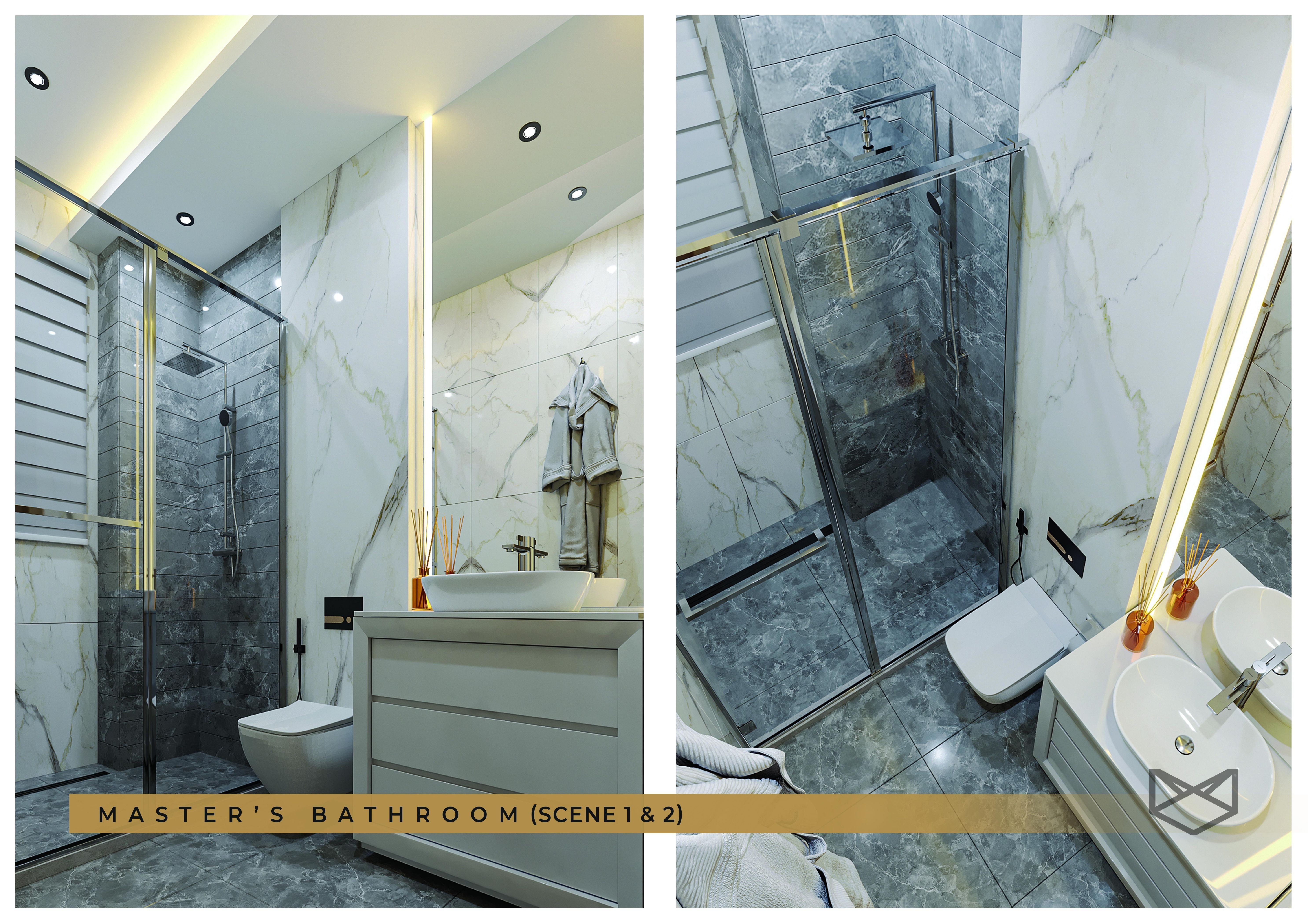 Step inside and the quality is unmistakable. Open-plan living rooms with dark dramatic ceilings, LED cove lighting, and premium velvet seating flow into connected kitchen spaces fitted with matte-black cabinetry, marble bar countertops, and integrated appliances. Master suites feature designer chandeliers, slat-wall headboard detailing, gold accent furniture, and marble-tiled en-suites with walk-in showers and gold fixtures. This is not mid-market — this is premium by any measure.